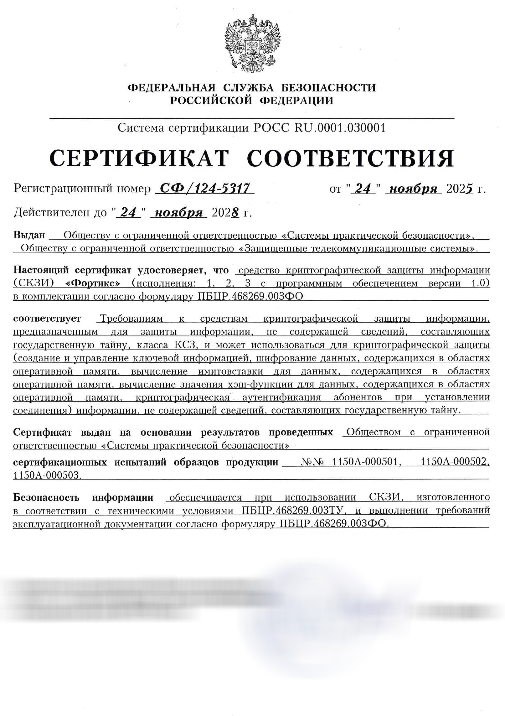 - СФ/124-5317 от 24.11.2025 (ФСБ России, СКЗИ класса КС3)